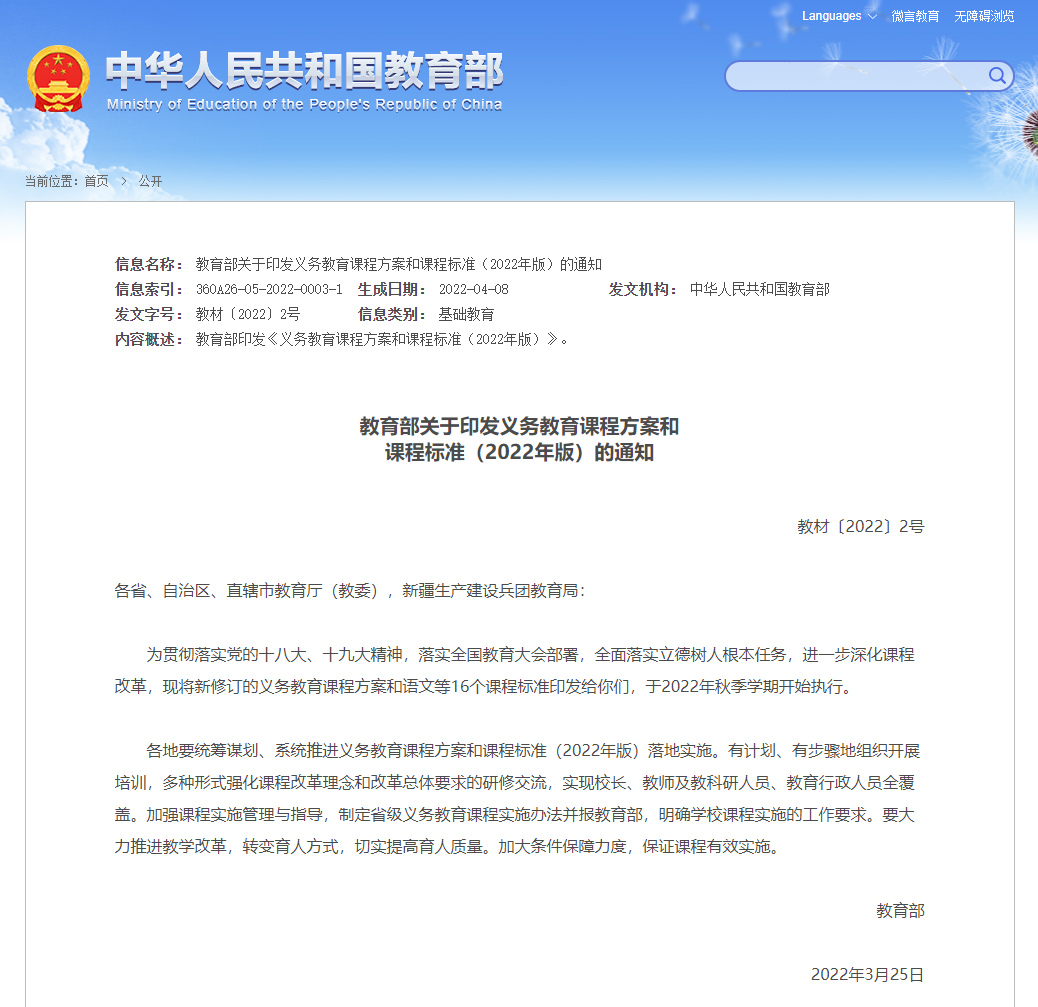 教育部印发《义务教育课程方案和课程标准(2022年版)》